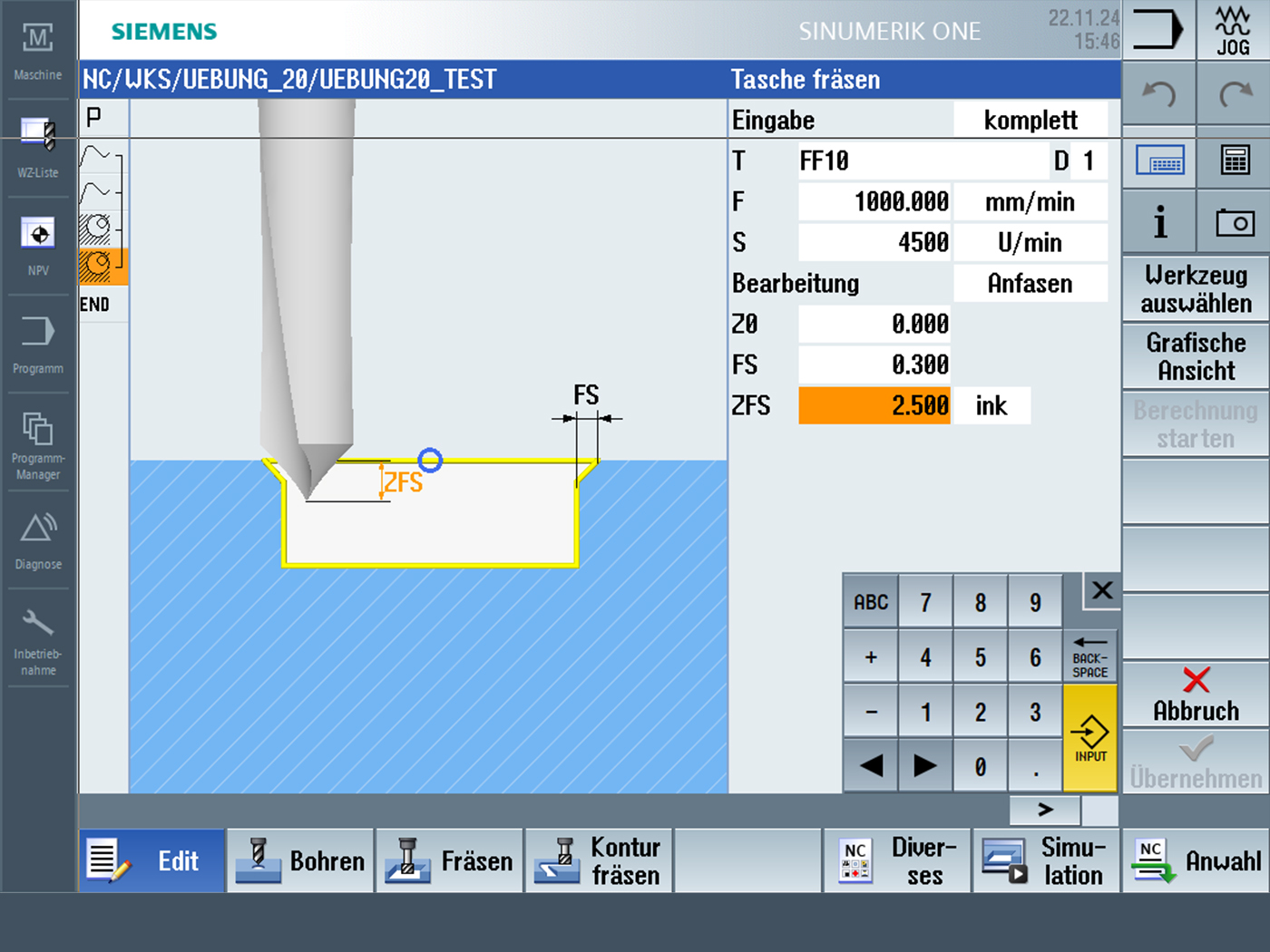 Für die Werkstattprogrammierung können NC-Programme wie an der echten Maschine erstellt, getestet und simuliert werden. Generell werden folgende Funktionen und Technologien unterstützt: Siemens Shopmill, Shopturn, Dreh-Fräs- und Fräs-Drehmaschinen, 2D, 3D, 3+2, 5-Achssimultan und die mehrkanalige Strukturprogammierung. Das erstellte Projekt inkl. Programm, Werkzeug- und Nullpunktinformationen kann über Netzwerk oder Datenträger an die Maschine übertragen werden.