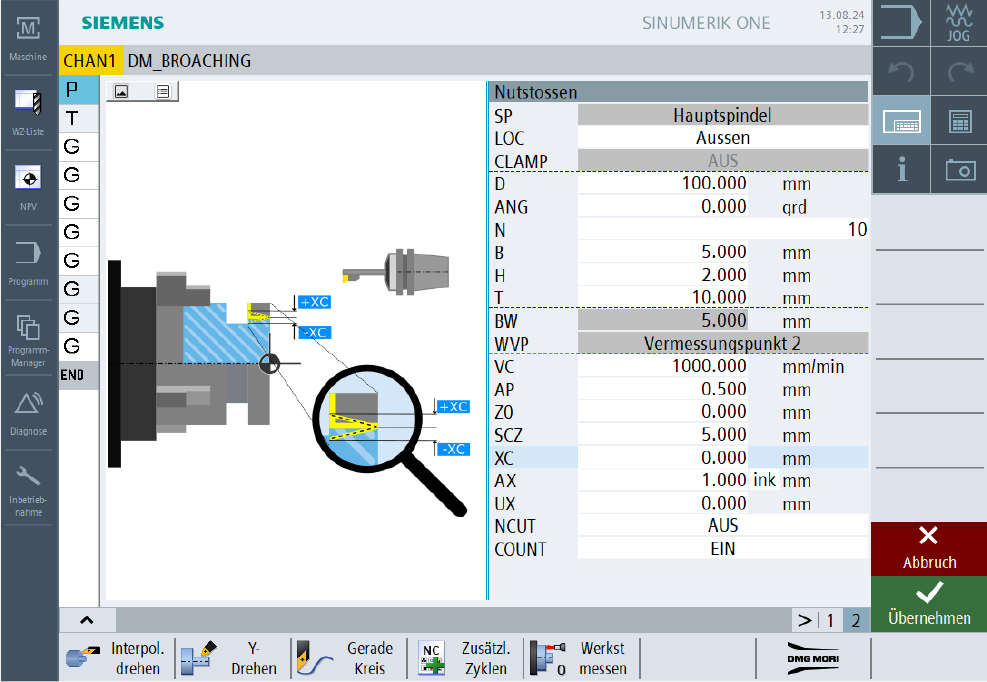 Die DMG MORI Konfiguration wird immer maschinenspezifisch erstellt. Dazu wird der reale NC- und HMI-Datensatz der Maschine für DMG MORI SinuTrain angepasst. Anschließend stehen nahezu alle relevanten Einstellungen und Zyklen wie an der Maschine zur Verfügung.